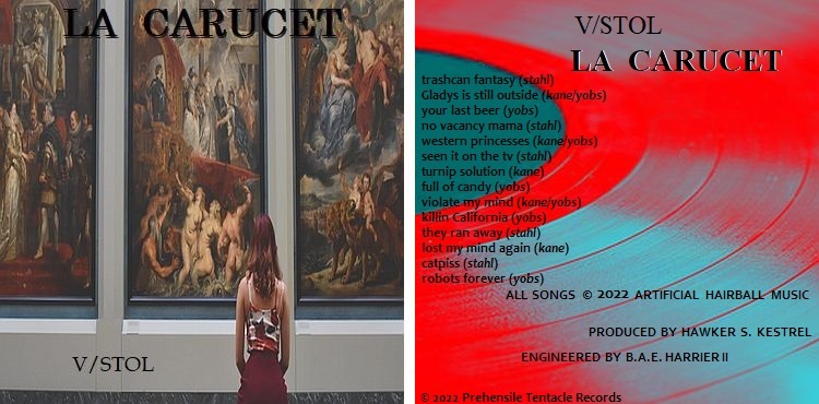Swedish art-pop masters V/STOL are back with a terrific release that’s as engrossing as it is enjoyable. Continuing the winning formula of last year’s Sharp as Sharks, the songs on La Carucet never parade their charms, unfolding at an easy pace with no wasted motion. This time around the mood is decidedly optimistic. No more ruminating on past decisions; no more empty bottle confessions of inadequacy. As probing and purifying as introspection can be, songs like “Trashcan Fantasy” and “No Vacancy Mama” have no need of shrinks’ couches, not when their mood is so light. Without being sentimental, “They Ran Away” recalls ones that got away and what might’ve beens like finding an old shopping list in last year’s winter coat and realizing you never did buy those olives.
